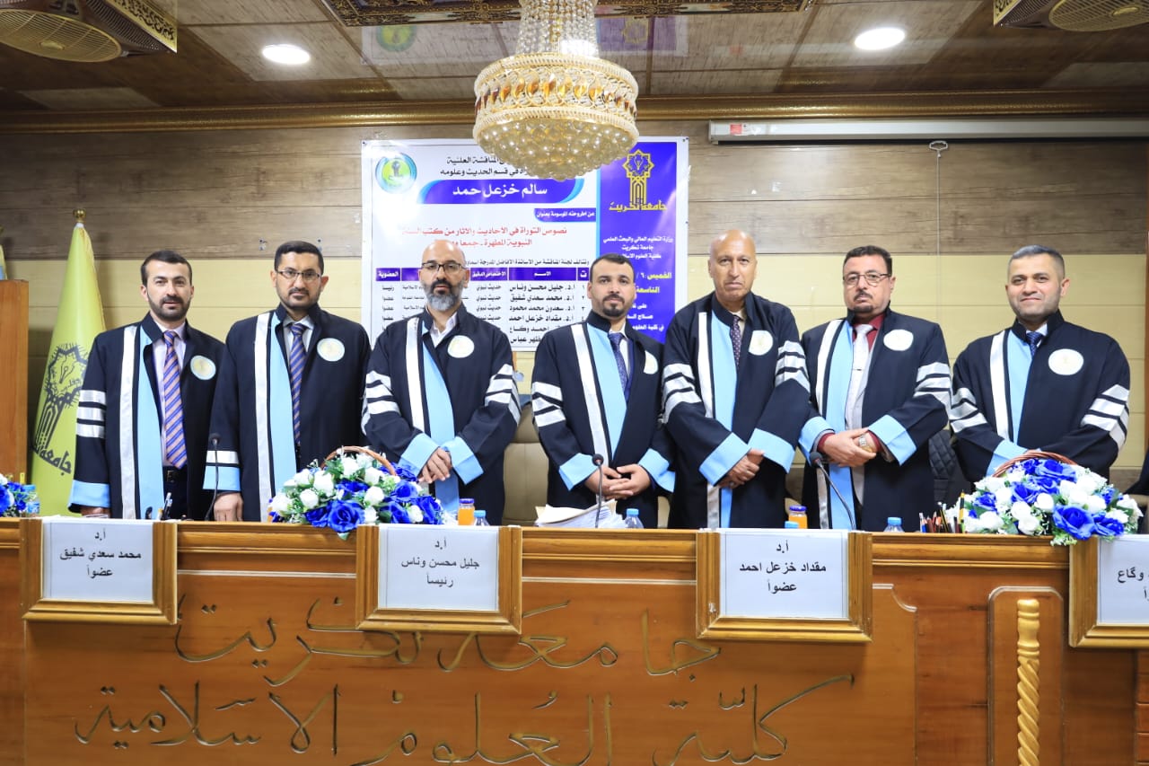 مناقشة أطروحة دكتوراه في قسم اصول الدين بعنوان ( أحاديث الفضائل والشمائل الحسان في كتاب كشف المناهج والتناقيح في تخريج أحاديث المصابيح للإمام المناوي (ت802هـ) دراسة تحليلية )