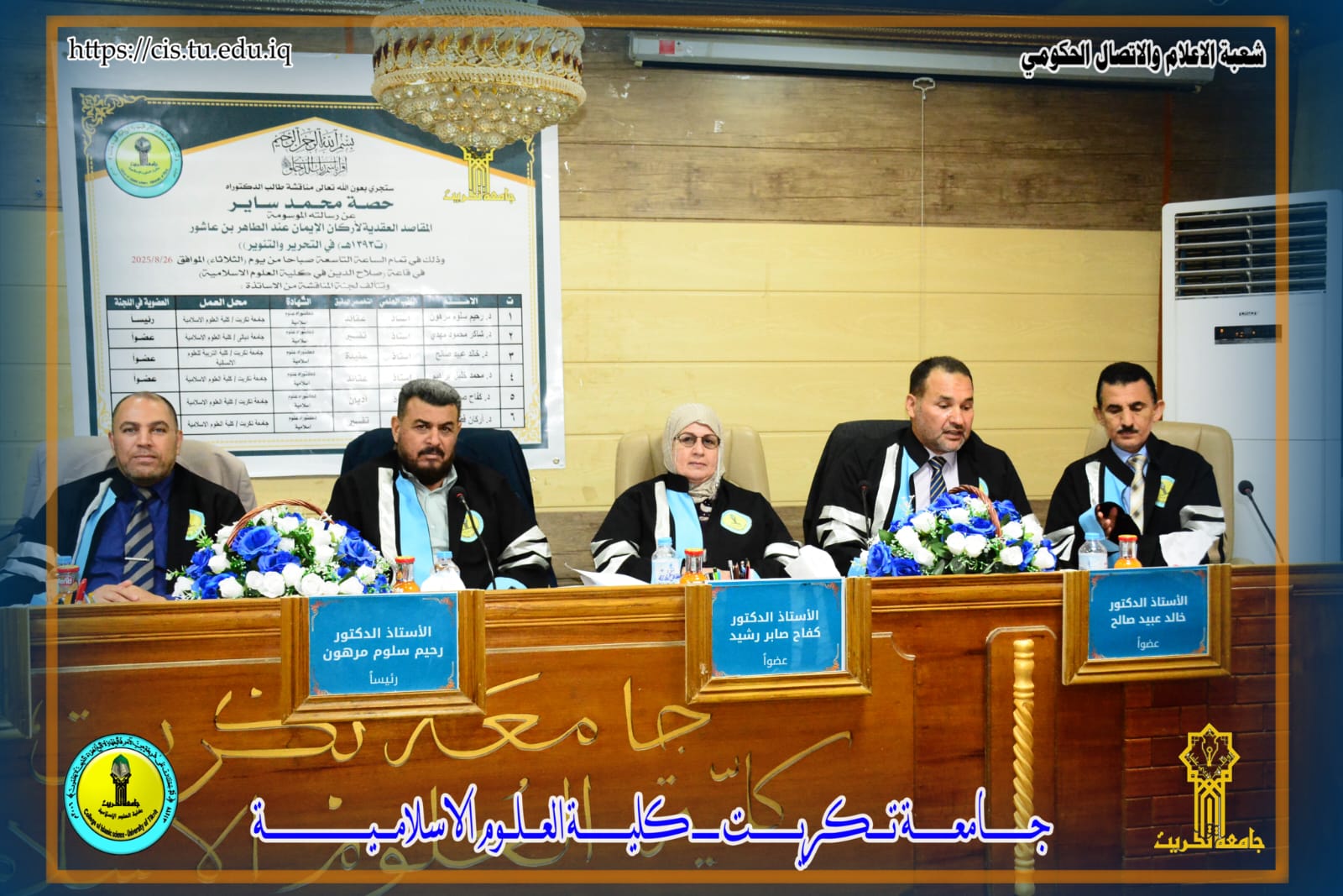 مناقشة اطروحة دكتوراه في قسم اصول الدين بعنوان ( المقاصد العقدية لأركان الإيمان عند الطاهر بن عاشور ت(١٢٩٣هـ) في التحرير والتنوير )