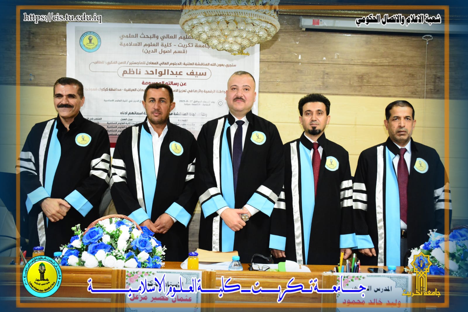 مناقشة رسالة الدبلوم العالي المعادل للماجستير / الامن الفكري في قسم اصول الدين بعنوان ( مفهوم المواطنة الرقمية وأثرها في تعزيز الامن الفكري لدى الجامعات العراقية_محافظة كركوك أنموذجاً )